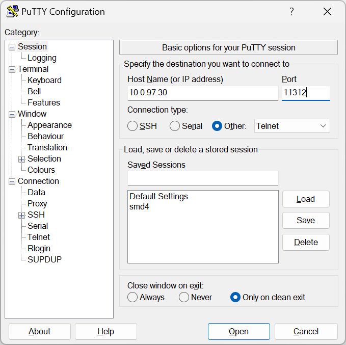 As with COM ports, most programming languages provide easy means to open a socket and communicate with network devices. Alternatively, use a terminal program such as PuTTY to manually type commands and see responses. See example PuTTY setup below; change IP address to suit your device.